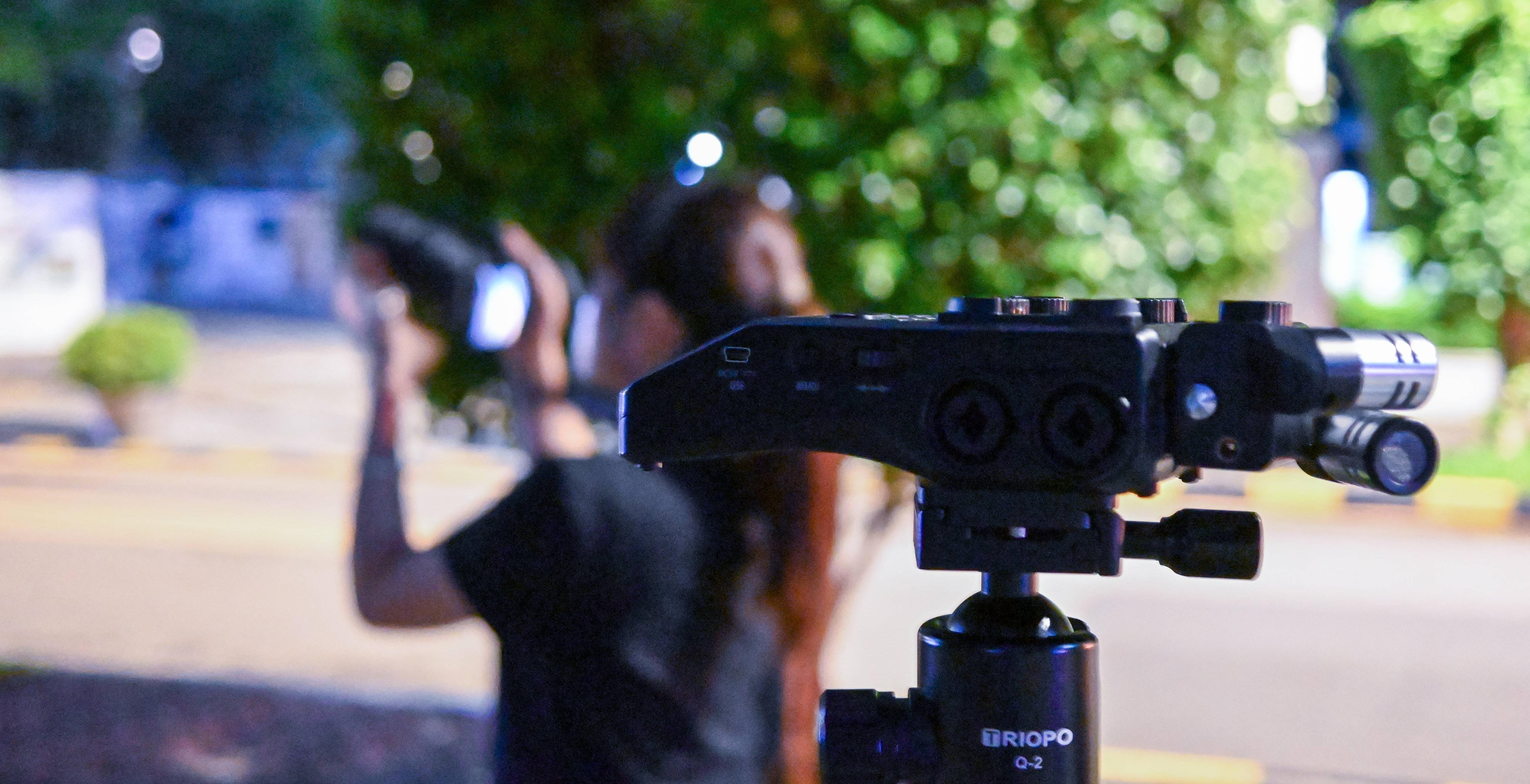Use RØDE NT-SF1 Ambisonic Microphone to record spatial audio outside the car, ZOOM H6 recorder to record Stereo audio, and SMARTSENSOR AR844 Decibel Meter to measure the decibel level of the environment. The RØDE NT-SF1 is mounted on the stand at a height of 1.6 m from the ground and also connected to the Mixer(PreMix-6 II) using wires, record the Ambix format and Fuma format at the same time; The ZOOM H6 recorder is mounted on the stand at a height of 1.6 m from the ground. The Decibel Meter is held by Pedestrian at a height of 1.6 m from the ground.