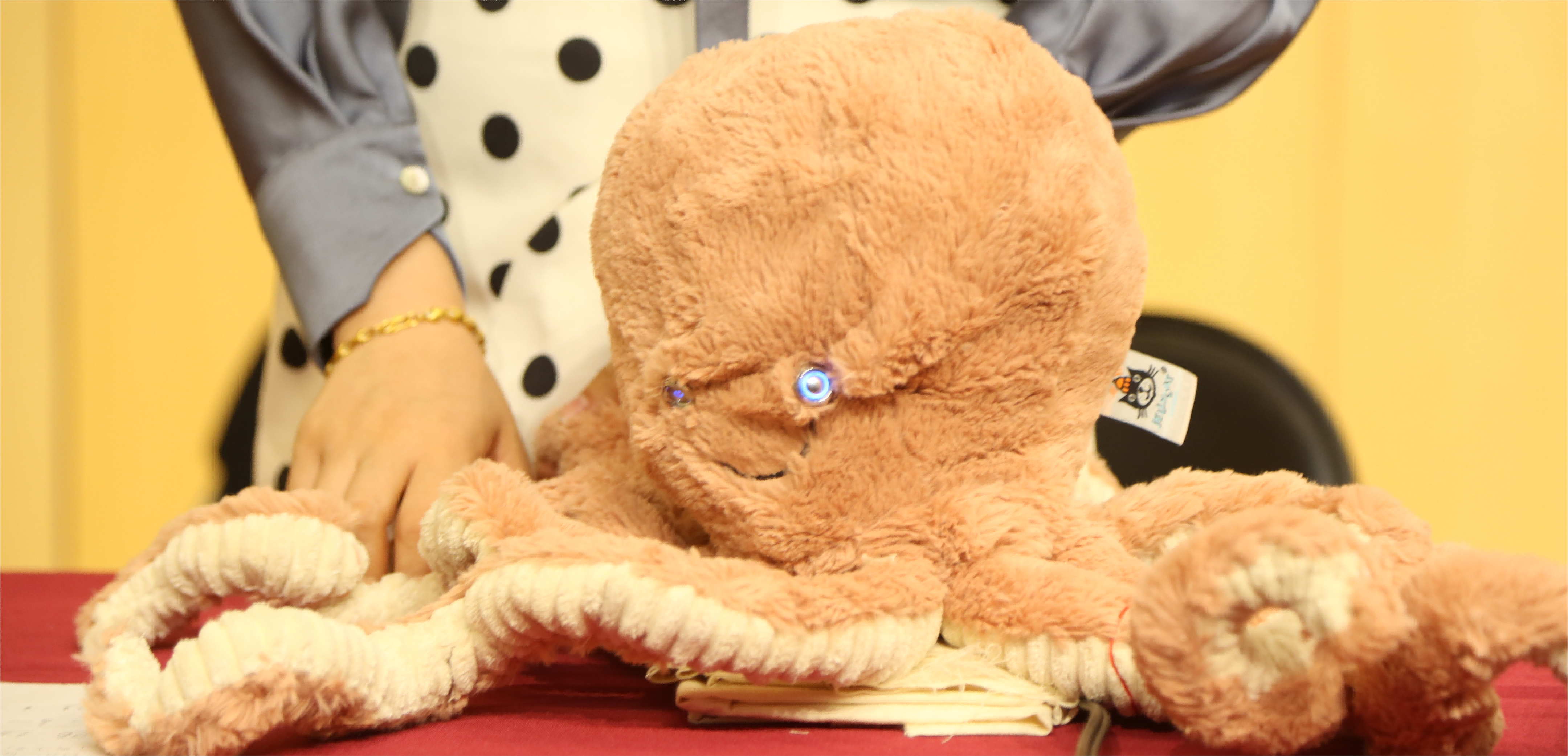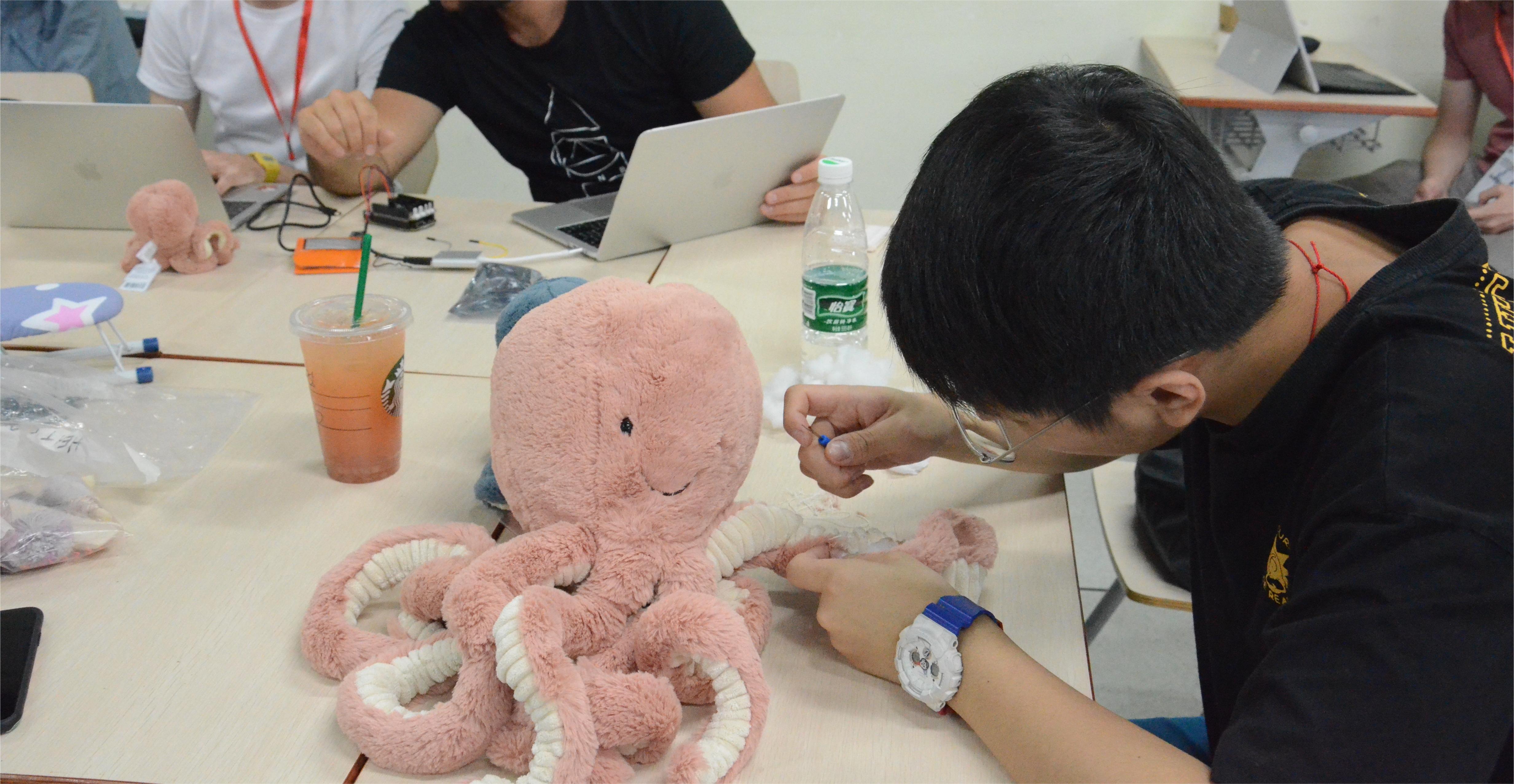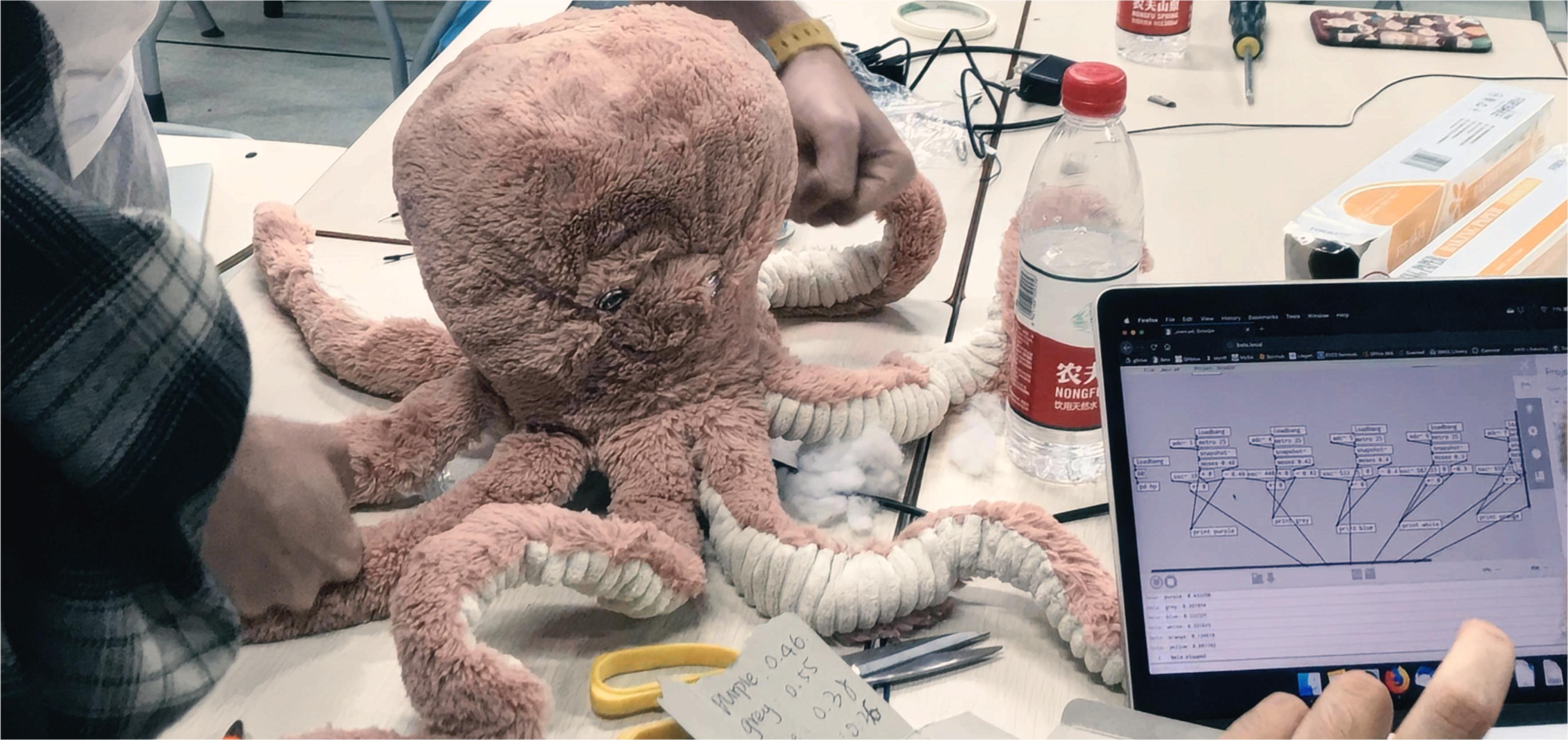 The Octoqin is made from an Octopusshaped doll, with six cloth pressure sensors sewn inside six of the legs to map to the six overtone positions on the string of a traditional Duxianqin. When the legs of the Octoqin are squeezed a recording of the note from a traditional Duxianqin is played by Bela with strength of squeeze mapped to volume. Movement of the Octoqin's head modifies pitch of the note produced, much like the joystick in the traditional Duxianqin.